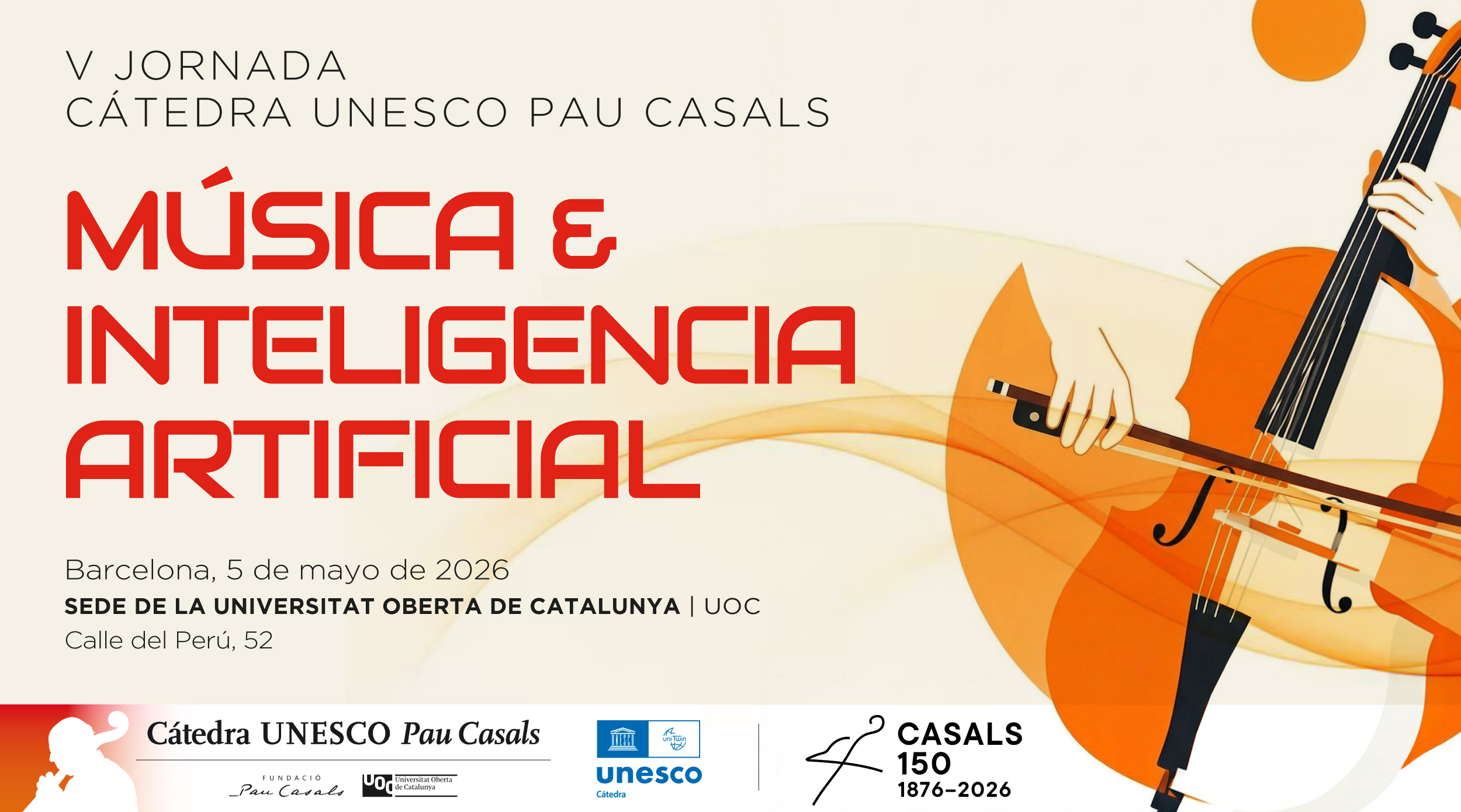 Bajo el título Música e inteligencia artificial, la V Jornada de la Cátedra Pau Casals toma como punto de partida el legado del Maestro para proponer una reflexión sobre los cambios en el mundo musical y las posibilidades que ofrece la inteligencia artificial. La visión humanista de Casals, entendida como herramienta de transformación social y cultural, que nos sirve para explorar como la innovación puede reforzar la expresividad artística.